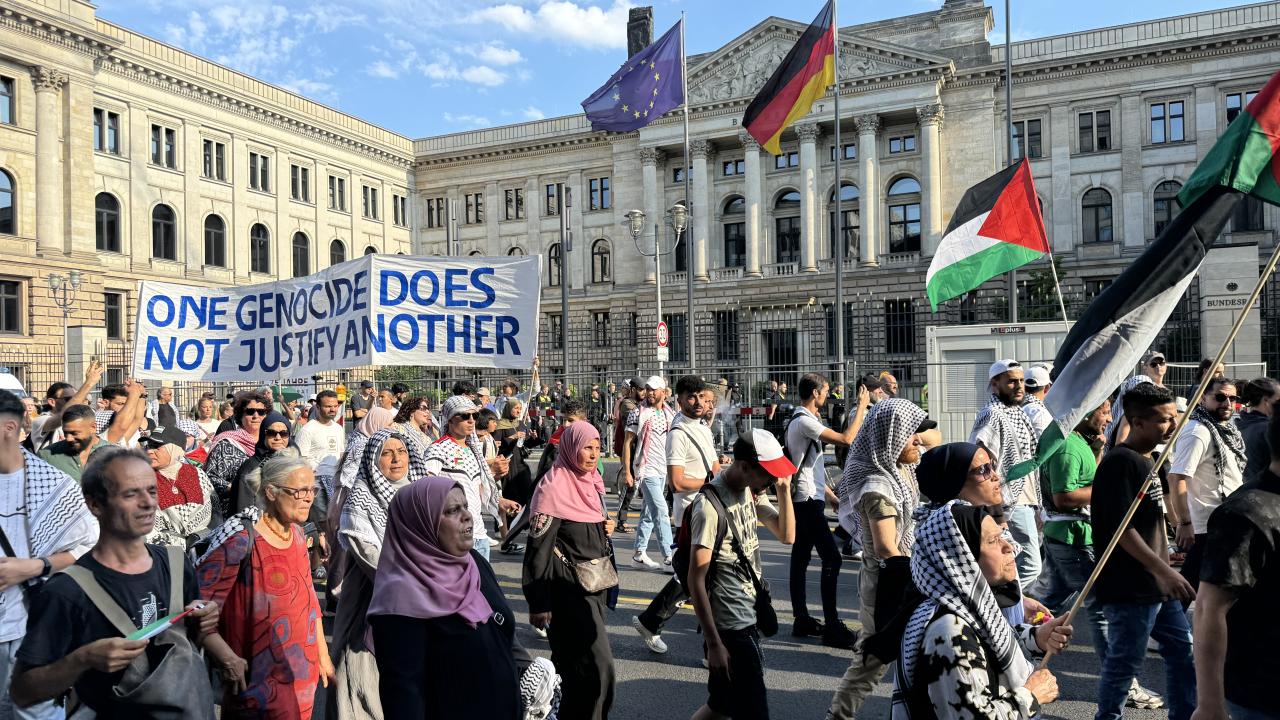 Yürüyüşün son noktası olan Potsdamerplatz’ta karşıt görüşlü üç kişinin İsrail bayrağını kaldırması üzerine gerginlikler arttı.